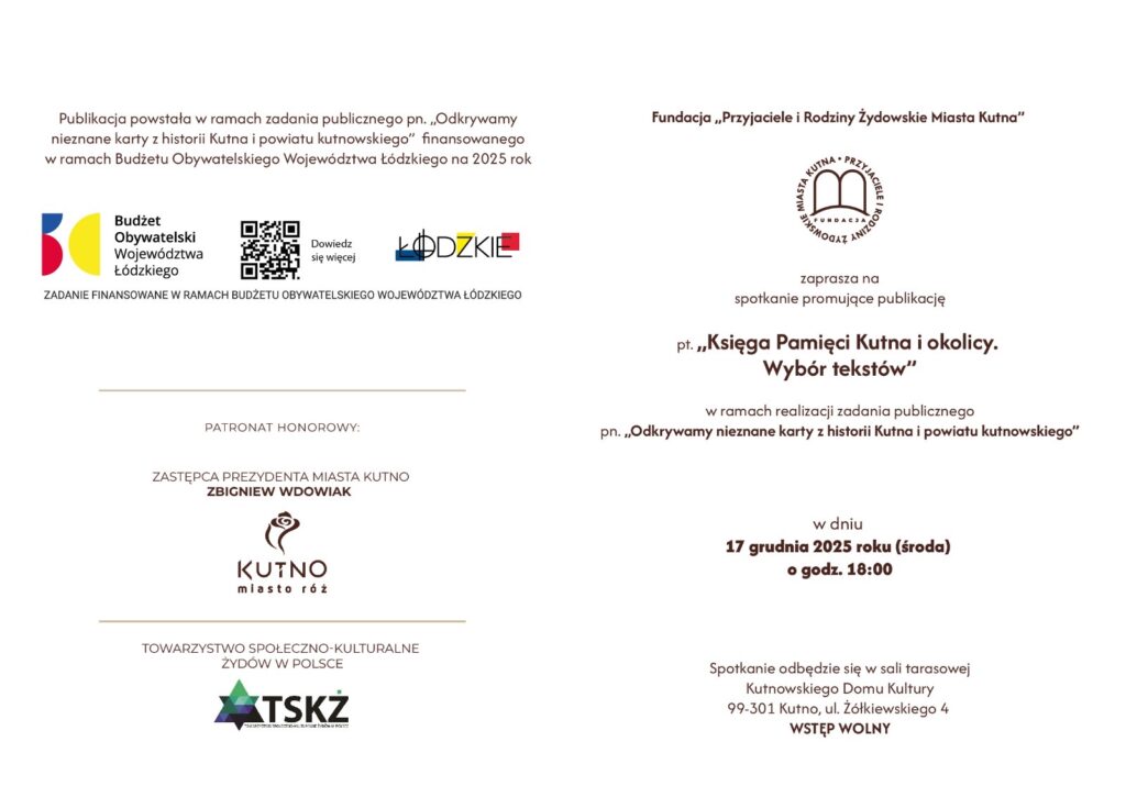 Spotkanie promujące publikację pt. „Księga Pamięci Kutna i okolicy. Wybór tekstów” w ramach realizacji zadania publicznego pn. „Odkrywamy nieznane karty z historii Kutna i powiatu kutnowskiego” odbędzie się 17 grudnia 2025 roku o godz. 18.00 w sali tarasowej Kutnowskiego Domu Kultury (wstęp wolny).